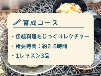 琉球料理の基礎から応用までを1年間で学べるコースです! 前期6ヶ月と後期6ヶ月に分かれており、合計36回のレッスンで、実践的なスキルを身につけることができます♪ さらに、修了後にはアシスタント業務も体験でき、学んだ知識を活かすチャンス◎